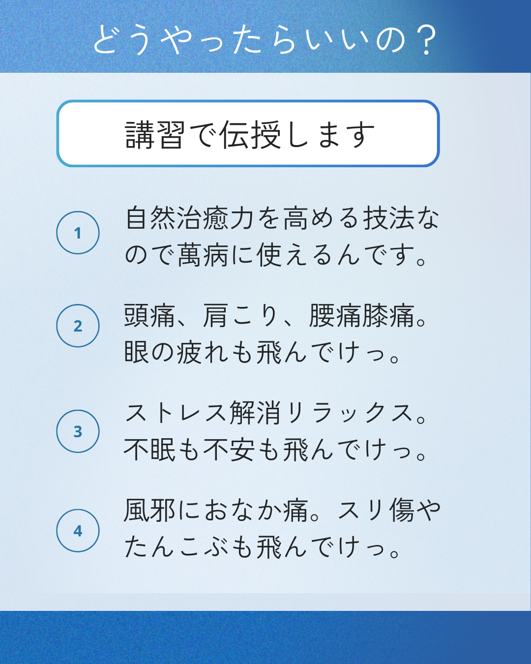 【ポイント3】講習後は、すぐに身近な方と心地よいヒーリングを楽しめます。